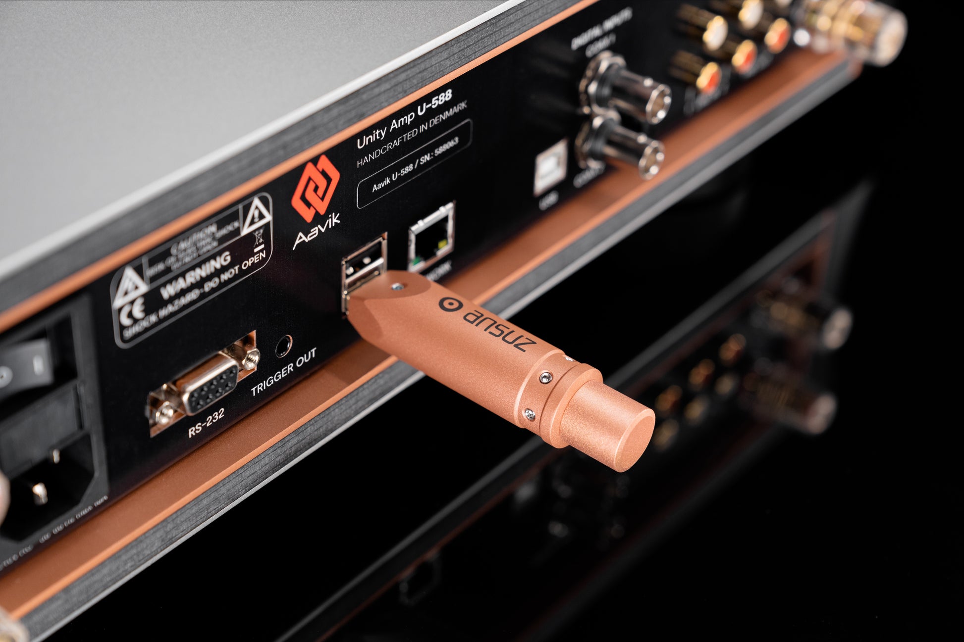 Glass-blasted copper. Copper end cap. Gold AARC module assisted by a zirconium rod in each. (XLR male/female, USB A/B or LAN RJ45)